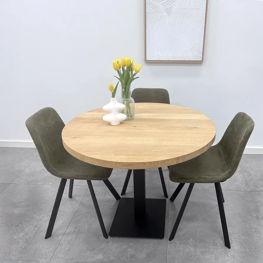A-Qualität (A/B) Eichenholz ist bekannt für seine stimmungsvolle und luxuriöse Ausstrahlung. Die Tischplatte aus Eiche wird mit durchgehenden Lamellen - mit einer Breite von 9-12 cm, extra breit für einen luxuriösen Akzent - in der Länge geliefert. Eine Eichen-Tischplatte wird standardmäßig unbehandelt, geschliffen und mit gefasten Kanten (einer 2 mm Radiusfase) ausgeliefert. Darüber hinaus bieten wir in unserem Online-Konfigurator verschiedene Zusatzoptionen an, um Ihren runden Eichenholz-Tisch ganz nach Ihren Wünschen zu bearbeiten und zu behandeln.