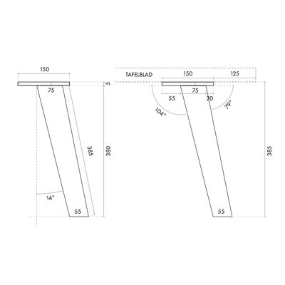 Die richtige Position bei 4 Tischbeinen: Sie haben die Möglichkeit, die Tischbeine entweder "gerade" oder "schräg" zu montieren. Beachten Sie im Falle der geraden Montage den Mindestabstand von 5,5 cm. Alternativ können Sie die Tischbeine (mit der Montageplatte) "schräg" anbringen. Dafür haben wir die Montageplatte mit einer speziellen Form versehen, die es Ihnen ermöglicht, die richtige Position in der Ecke ganz einfach zu bestimmen.