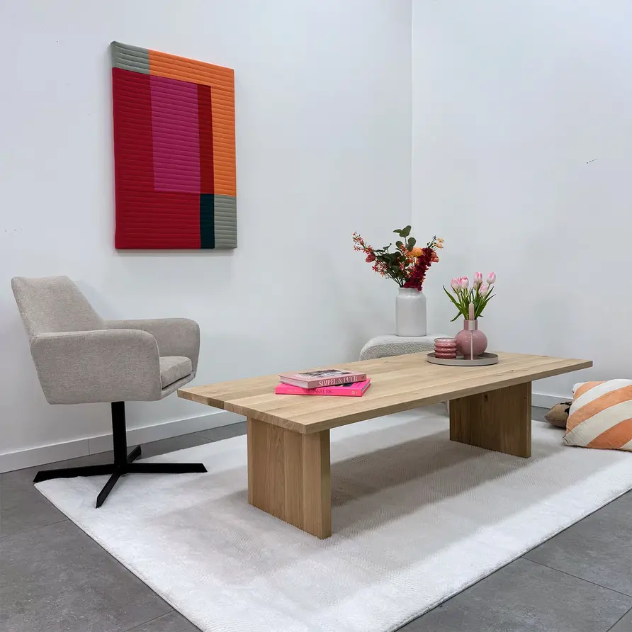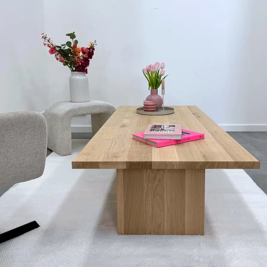 Couchtisch Eiche massiv - nach Maß - 4 cm stark (40 mm, 1-lagig) - Eichenholz rustikal (B/C) - Wohnzimmertisch mit breiten Lamellen (9-12 cm) - Hochwertiges Eichen-Massivholz verleimt - künstlich getrocknet (HF 8-12%). Ein wunderschöner Couchtisch aus Eiche, 40 mm stark, der von unseren Holzarbeitern mit viel Sorgfalt und Liebe maßgefertigt wird. Ein rechteckiger Wohnzimmertisch aus Eiche ist stimmungsvoll und vielseitig einsetzbar, ideal für die meisten Einrichtungsstile. Rustikales Eichenholz - mit einer B-Qualität Sichtseite - enthält Äste und Risse. Dies sorgt für ein natürliches und lebendiges Aussehen.