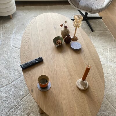 Couchtisch Eiche oval/elliptisch massiv - 2,7 cm stark (27 mm, 1-lagig) - Eichenholz rustikal (B/C) - Wohnzimmertisch mit breiten Lamellen (9-12 cm) - Hochwertiges Eichen-Massivholz verleimt - künstlich getrocknet (HF 8-12%). Ein wunderschöner Eichenholz-Couchtisch in Ovalform, 27 mm stark, der von unseren Holzarbeitern mit viel Sorgfalt und Liebe gefertigt wird und in verschiedenen Standardgrößen verfügbar ist. Ein ovaler Tisch aus Eiche ist stilvoll und wirkt modern, perfekt für einen eleganten Look. Die Form ist nicht streng oval, sondern fließend und "oval-ähnlich", zwischen Oval und Ellipse: Eine einzigartige und attraktive Tischplattenform. Rustikales Eichenholz - mit einer B-Qualität Sichtseite - enthält Äste und Risse. Dies sorgt für ein natürliches und lebendiges Aussehen.