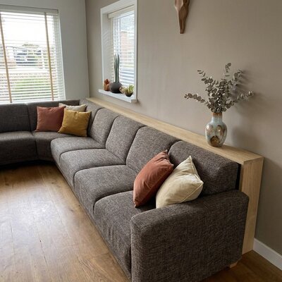 Konsolentisch Eiche massiv (inkl. Tischbeine) - für hinter dem Sofa - nach Maß - 14-50 cm breit - 50-248 cm länge - 70-100 cm höhe - 2,7 cm stark (27 mm, 1-lagig) - Eichenholz A-Qualität (A/B) - Wandtisch mit breiten Lamellen (9-12 cm) - Hochwertiges Eichen-Massivholz verleimt - künstlich getrocknet (HF 8-12%). Ein wunderschöner Eichen-Konsolentisch, 27 mm stark, der von unseren Holzarbeitern mit viel Sorgfalt und Liebe maßgefertigt wird. Dieser schmale Wandtisch ist äußerst beliebt für hinter dem Sofa, kann jedoch selbstverständlich auch als normaler Konsolentisch verwendet werden. Dieser komplette Konsolentisch besteht aus der Tischplatte, den Tischbeinen und einer Rückwand. Der Tisch kann mit verschiedenen Kantenbearbeitungen ausgestattet werden - für einen einzigartigen Eichenholz-Wandtisch. Fehlerfreies Eichenholz - mit einer A-Qualität Sichtseite - enthält praktisch keine Äste und Risse. Dies sorgt für ein stilvolles und elegantes Aussehen.