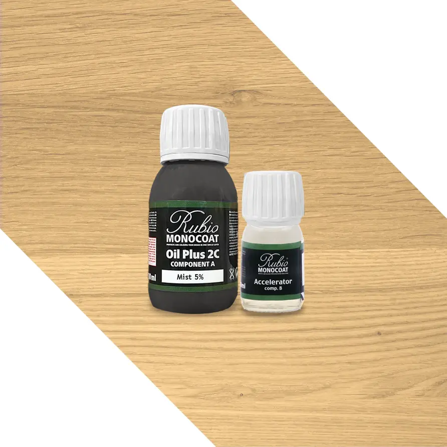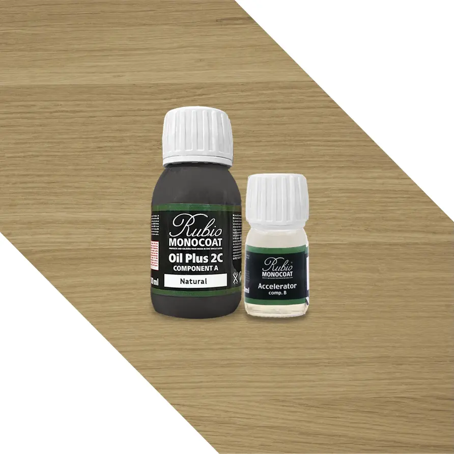 Rubio Monocoat Öl ist ist im Grunde ein 1-Komponenten-Holzöl. Bei Holzprodukten, die aktiv genutzt werden, einer hohen Beanspruchung ausgesetzt sind und möglicherweise mit Wasser oder Feuchtigkeit in Kontakt kommen - wie beispielsweise eine Eichen-Tischplatte - wird in der Regel die Verwendung eines 2-Komponenten-Produkts (Monocoat-Öl A + B-Komponente) empfohlen. Dieses bietet den Vorteil, besonders robust und widerstandsfähig zu sein. Darüber hinaus überzeugt ein 2-Komponenten-Öl durch seine schnelle Trocknungs- und Aushärtezeit, was die Verarbeitung zusätzlich erleichtert.