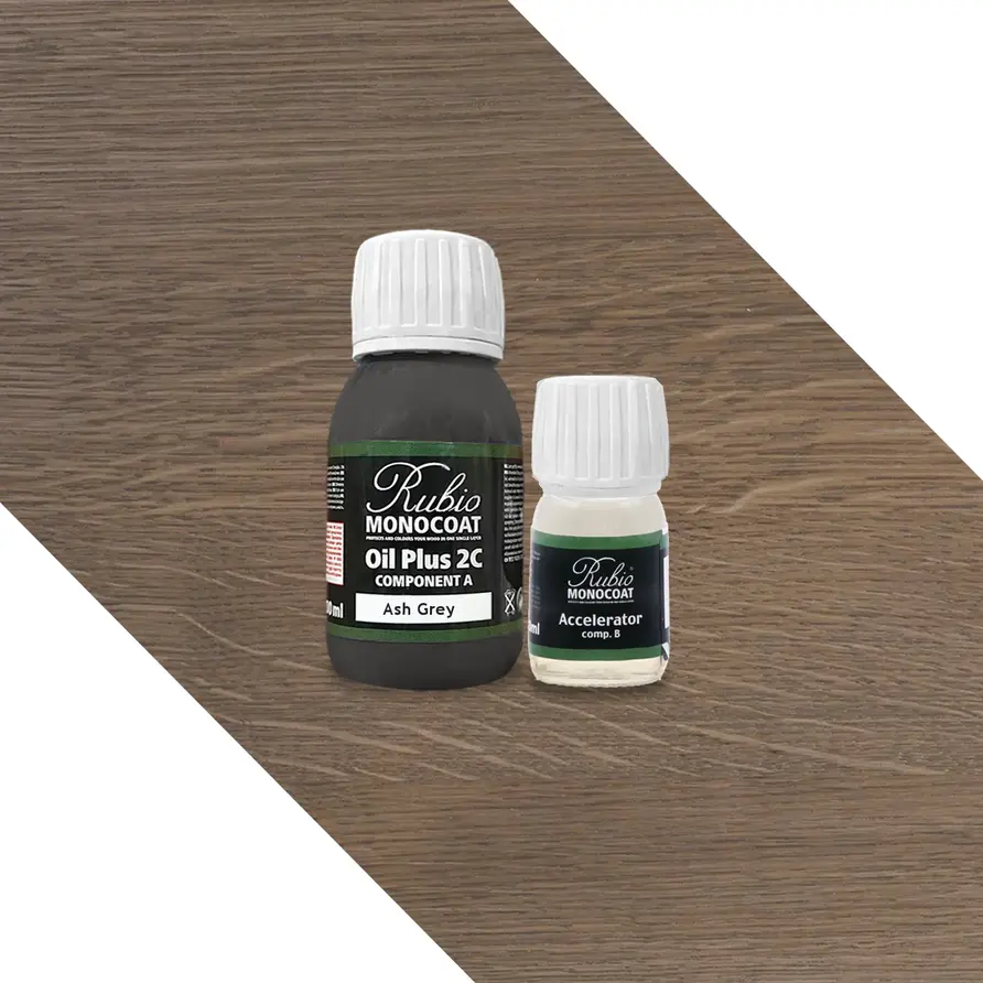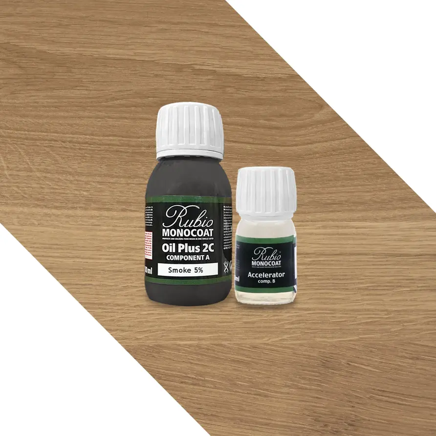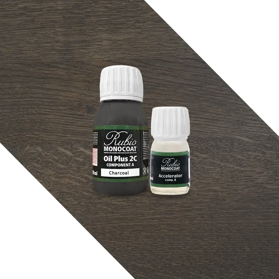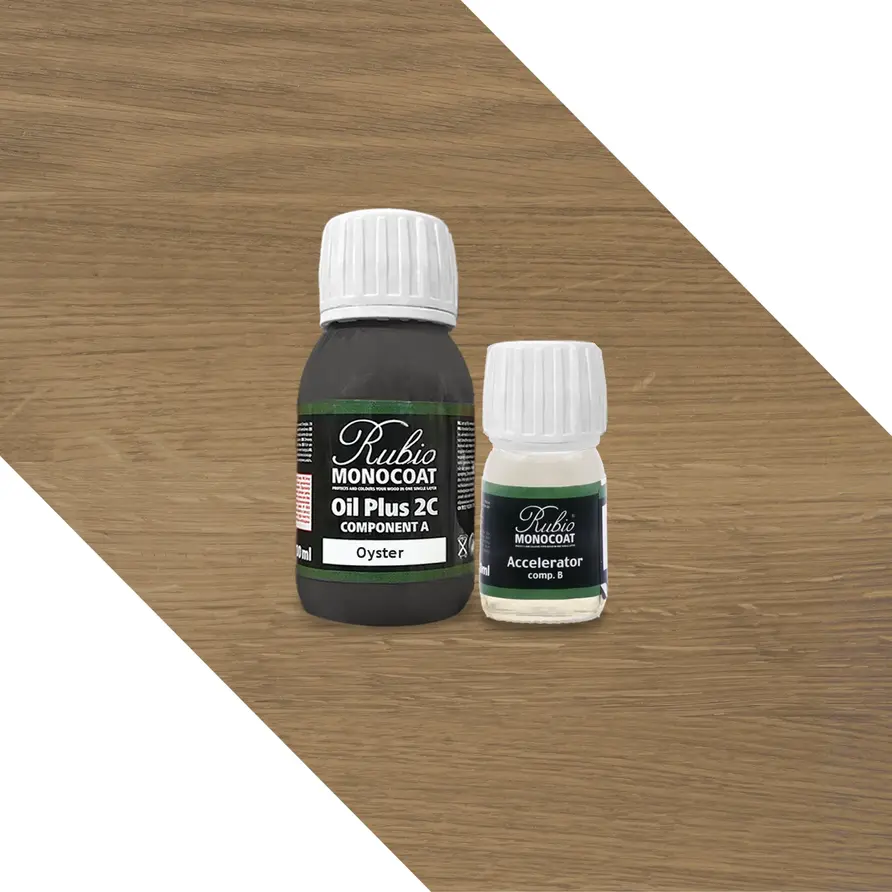 Rubio Monocoat-Öl (A + B) - in verschiedenen Farben erhältlich - 0,13 Liter (ca 5 m2) - 2 Komponenten (2+) - für den Innenbereich geeignet. Möchten Sie Ihre Eichentischplatte mit einem hochwertigen 2-Komponenten-Öl in einem speziellen Farbton versehen? Dann ist das Rubio Monocoat Öl +2C (2 Komponenten, A+B) ein ideales Produkt. Dies ist ein hochwertiges 2-Komponenten-Öl (A+B), das sich ideal zur Behandlung von unbehandeltem (Eichen)Holz eignet.