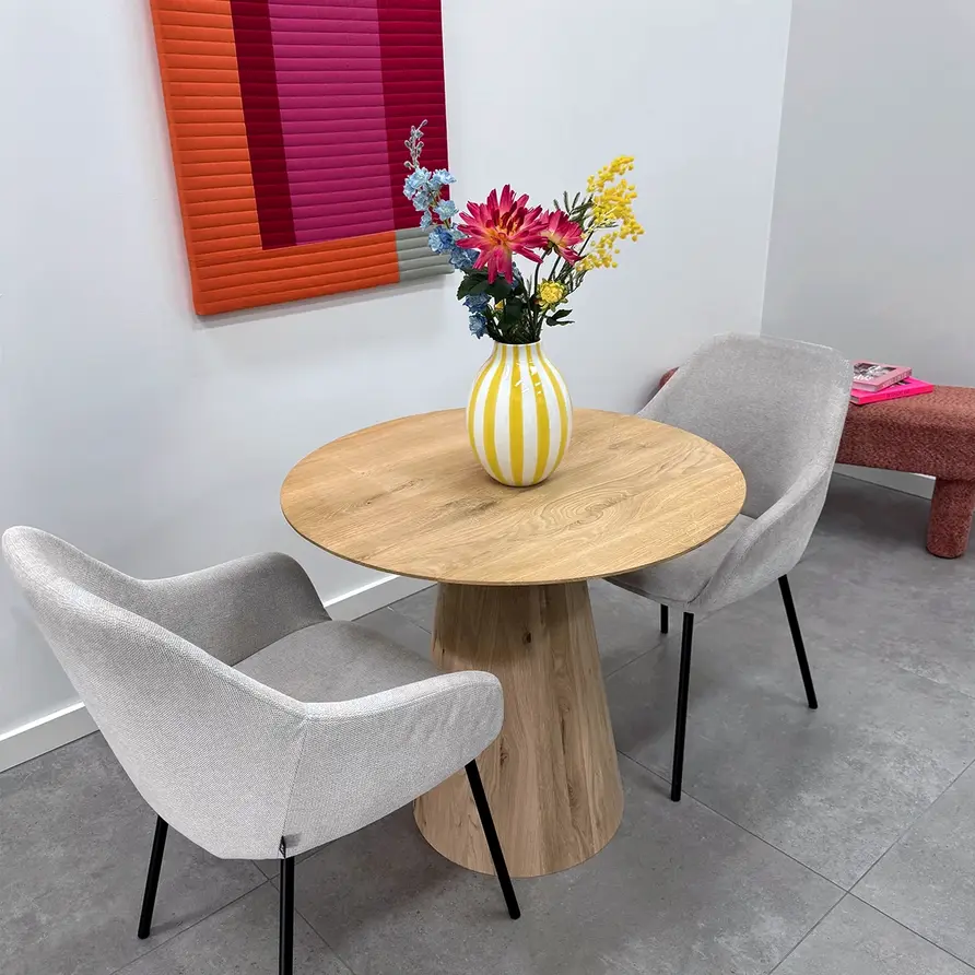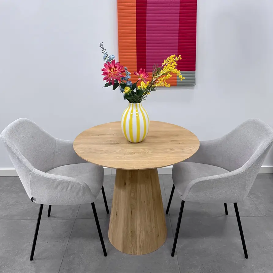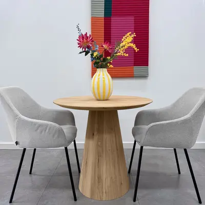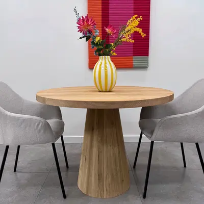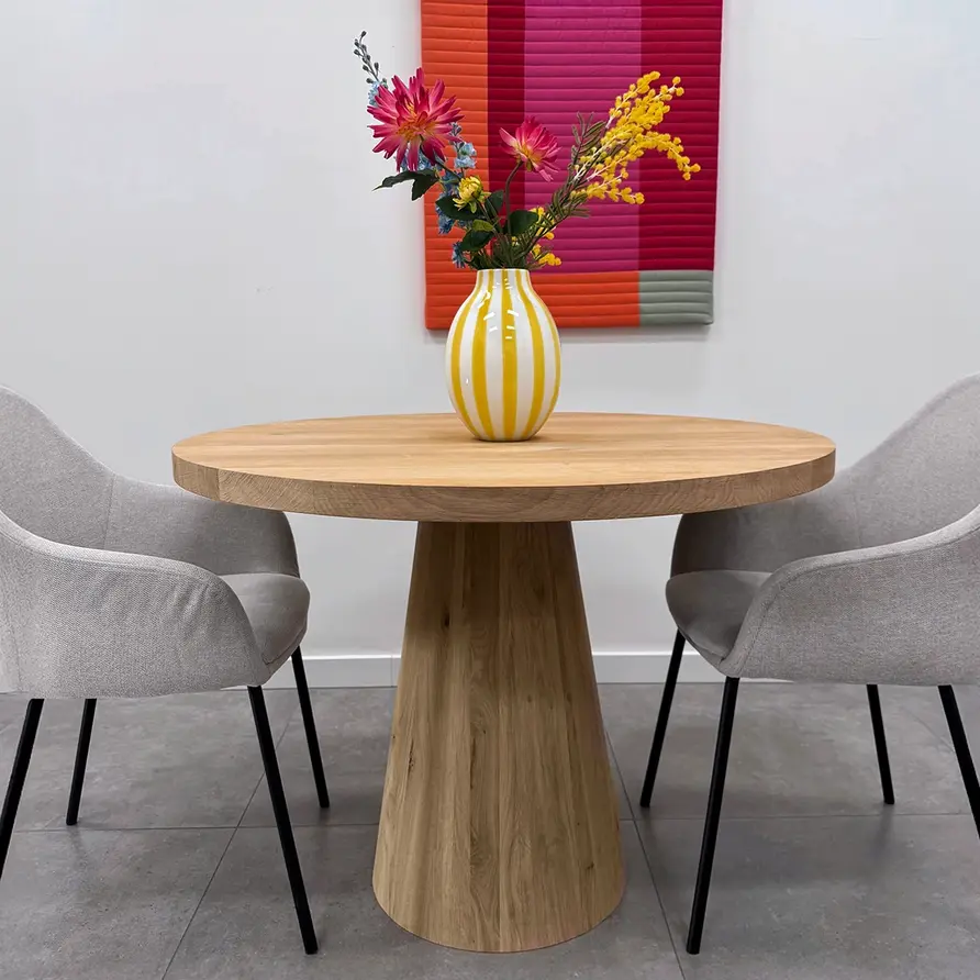 Eichen Kegelfuß - 25-45 cm groß und 71 cm hoch - geeignet für runde und quadratische Tischplatten von 70x70 cm bis 150x150 cm. Ein lebendiges und trendiges Esstischgestell mit zentralem Säulenfuß aus rustikalem Eichenholz. Lesen Sie mehr