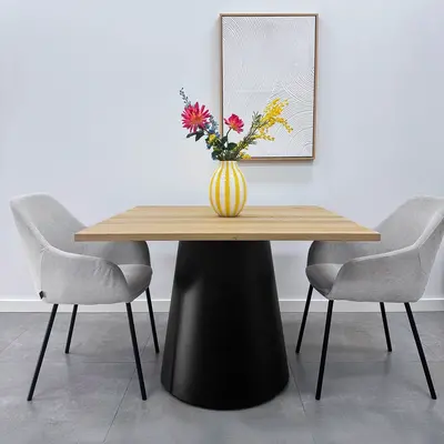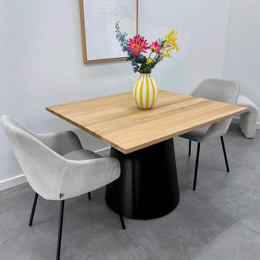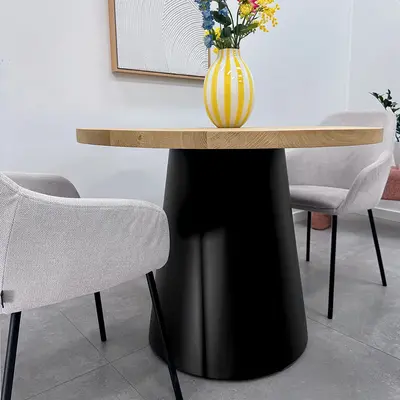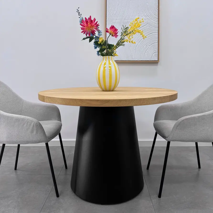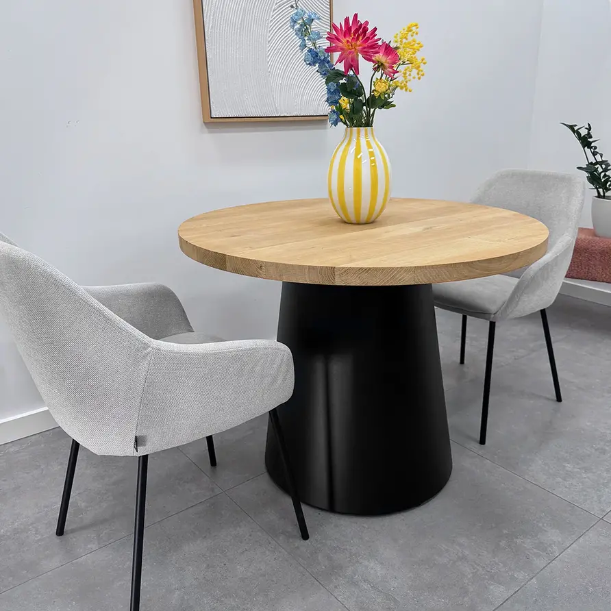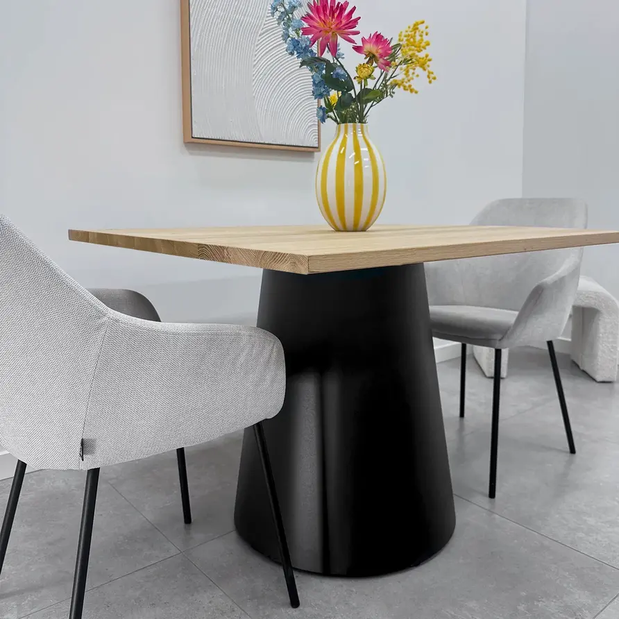 Ein schwarz beschichtetes Säulengestell aus Metall, ideal für einen besonderen runden (Eichen)-Esstisch. Ein zentrales Säulengestell wird oft auch als Säulenfuß, Tischfuß oder Mittelfuß bezeichnet. Dieses Säulen-Esstischgestell wird von erfahrenen Metallarbeitern von Hand geschweißt und mit einer hochwertigen schwarzen Pulverbeschichtung veredelt. Das schwarze Tischgestell hat eine imposante Säulenform, die stillvoll und imposant wirkt.