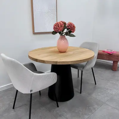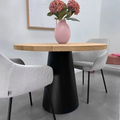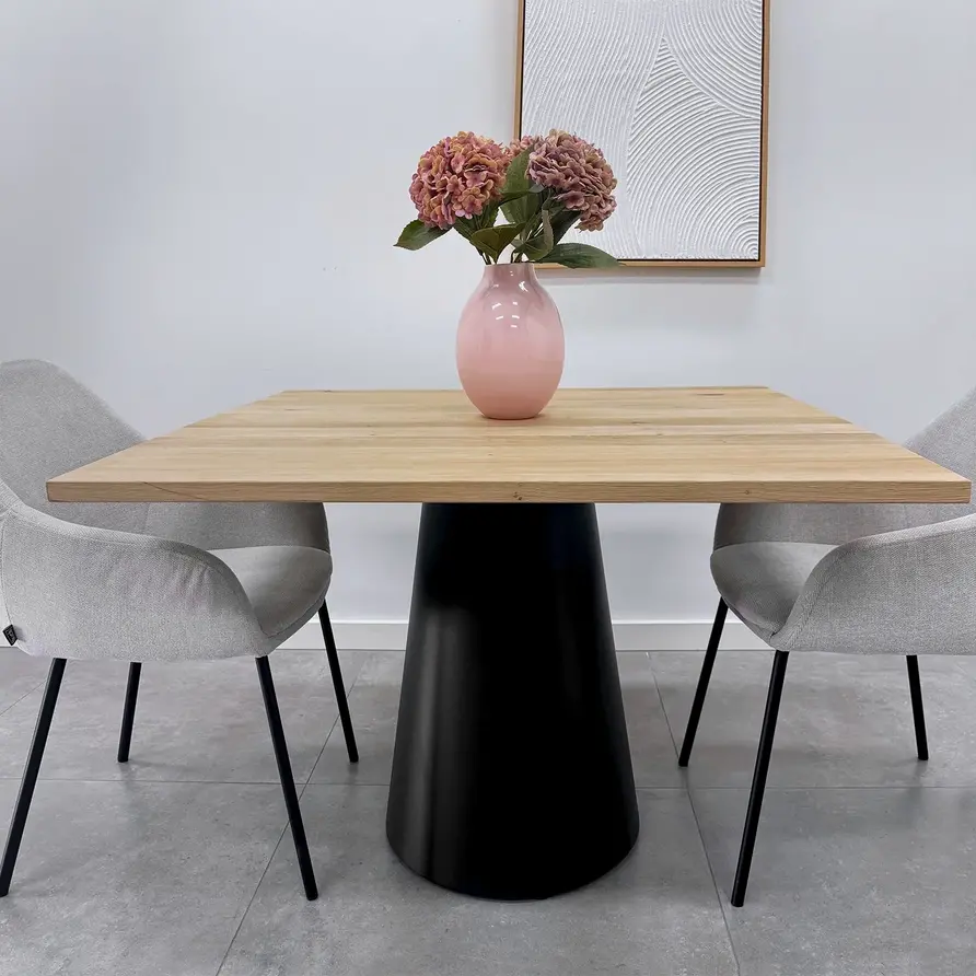 Ein schwarz beschichtetes Säulengestell aus Metall, ideal für einen besonderen runden (Eichen)-Esstisch. Ein zentrales Säulengestell wird oft auch als Säulenfuß, Tischfuß oder Mittelfuß bezeichnet. Dieses Säulen-Esstischgestell wird von erfahrenen Metallarbeitern von Hand geschweißt und mit einer hochwertigen schwarzen Pulverbeschichtung veredelt. Das schwarze Tischgestell hat eine stillvolle Säulenform, die stillvoll und trendig wirkt.