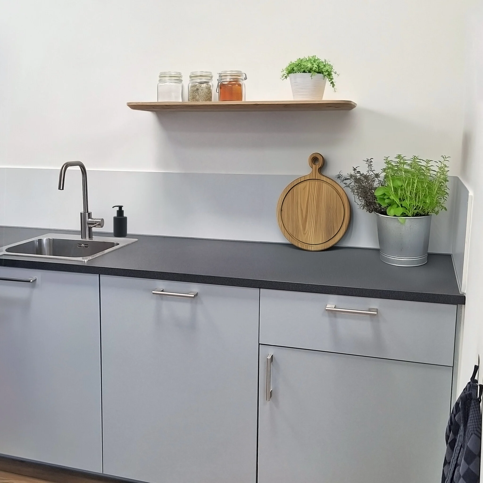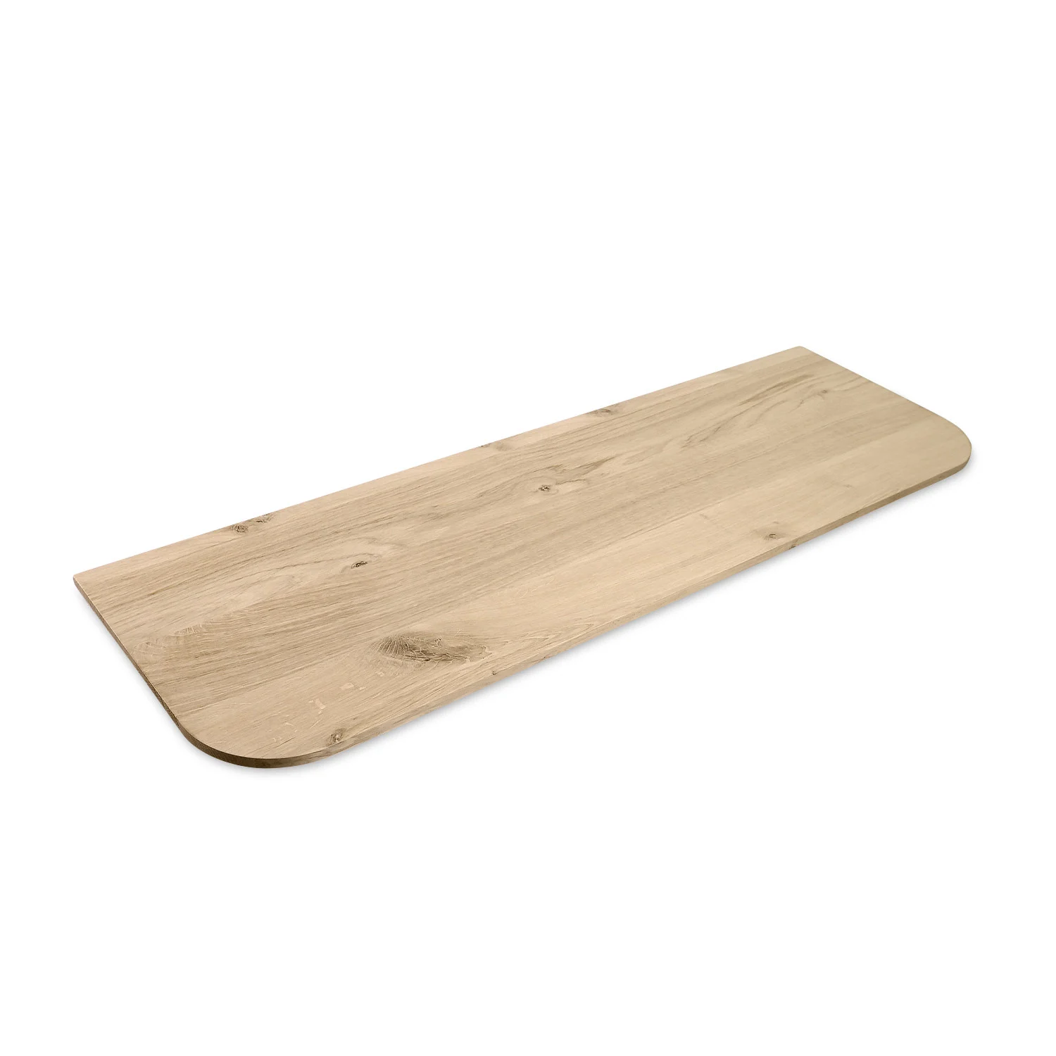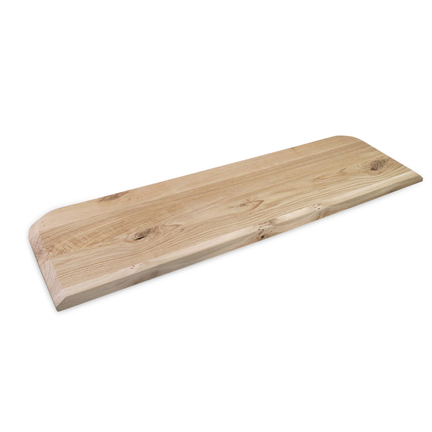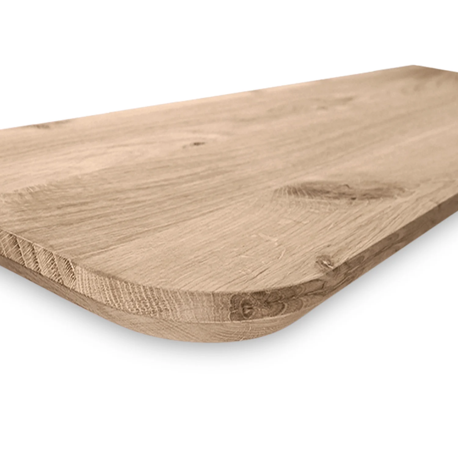 Zusätzlich zu den geraden Kanten (gefast mit einem Radius von 2 mm) können Sie auch zwei abgerundete Ecken mit (3-seitiger) Schweizer Kante wählen. Eine Schweizer Kante verleiht Ihrem Eichenprodukt eine besonders luxuriöse Ausstrahlung & die abgerundeten Ecken verleihen Ihrem Eichenprodukt sofort einen einzigartigen & trendigen Akzent. Eine Schweizer Kante wird – an der langen Vorderseite und beiden kurzen Seiten – etwa 1 cm von der Plattenkante nach innen hin abgeschrägt. Dadurch wirkt das Eichenprodukt elegant und schlank, ohne die Stabilität einer "dicken" Holzplatte einzubüßen. Die Ecken sind mit einem (kleinen) Radius von 5 cm abgerundet. Der Radius gibt an, wie viele Zentimeter von der Kante entfernt die Rundung beginnt. Auch hierbei werden die Kanten abgerundet und mit einer 2-mm-Fase (Abkantung) versehen.