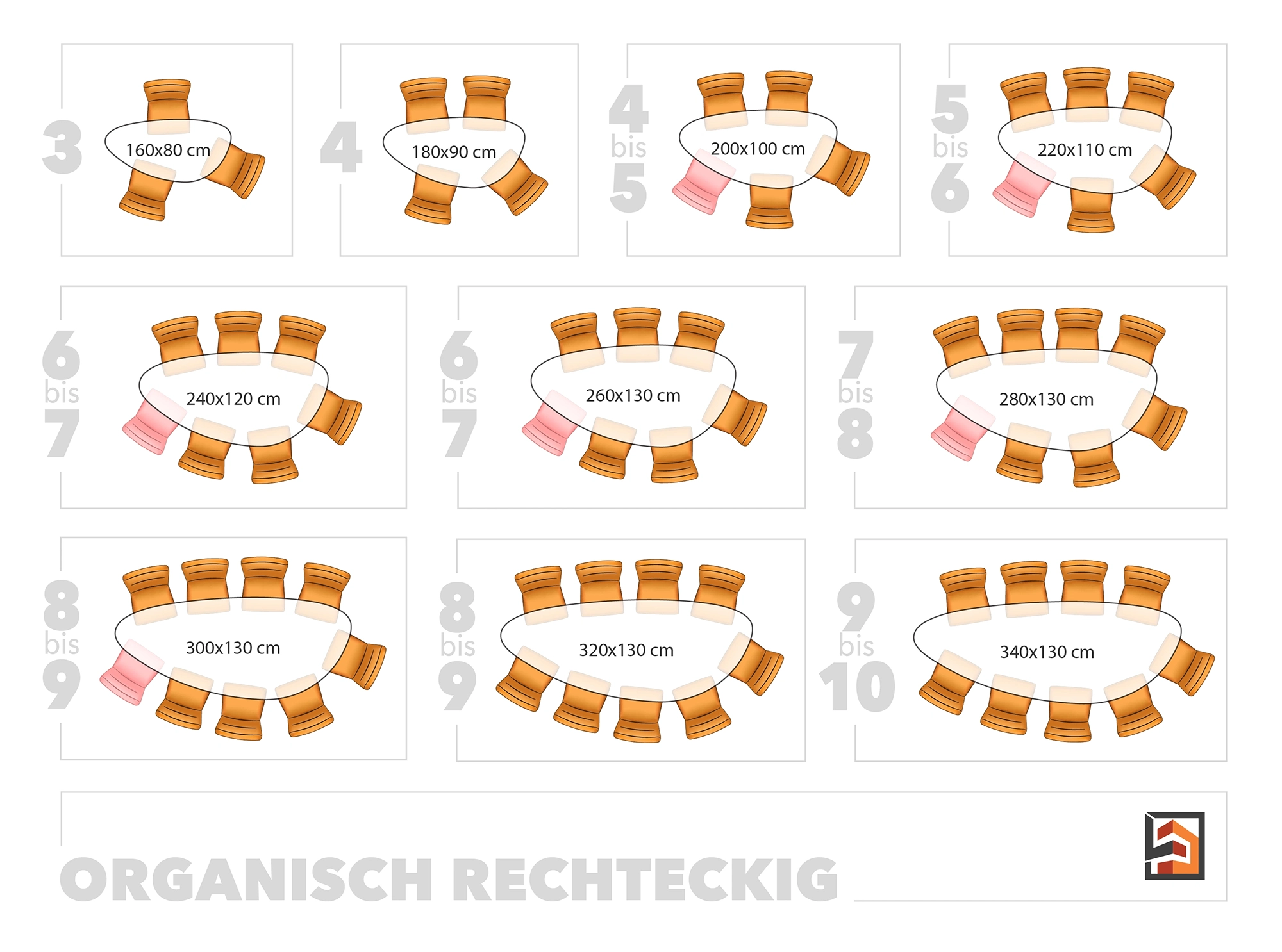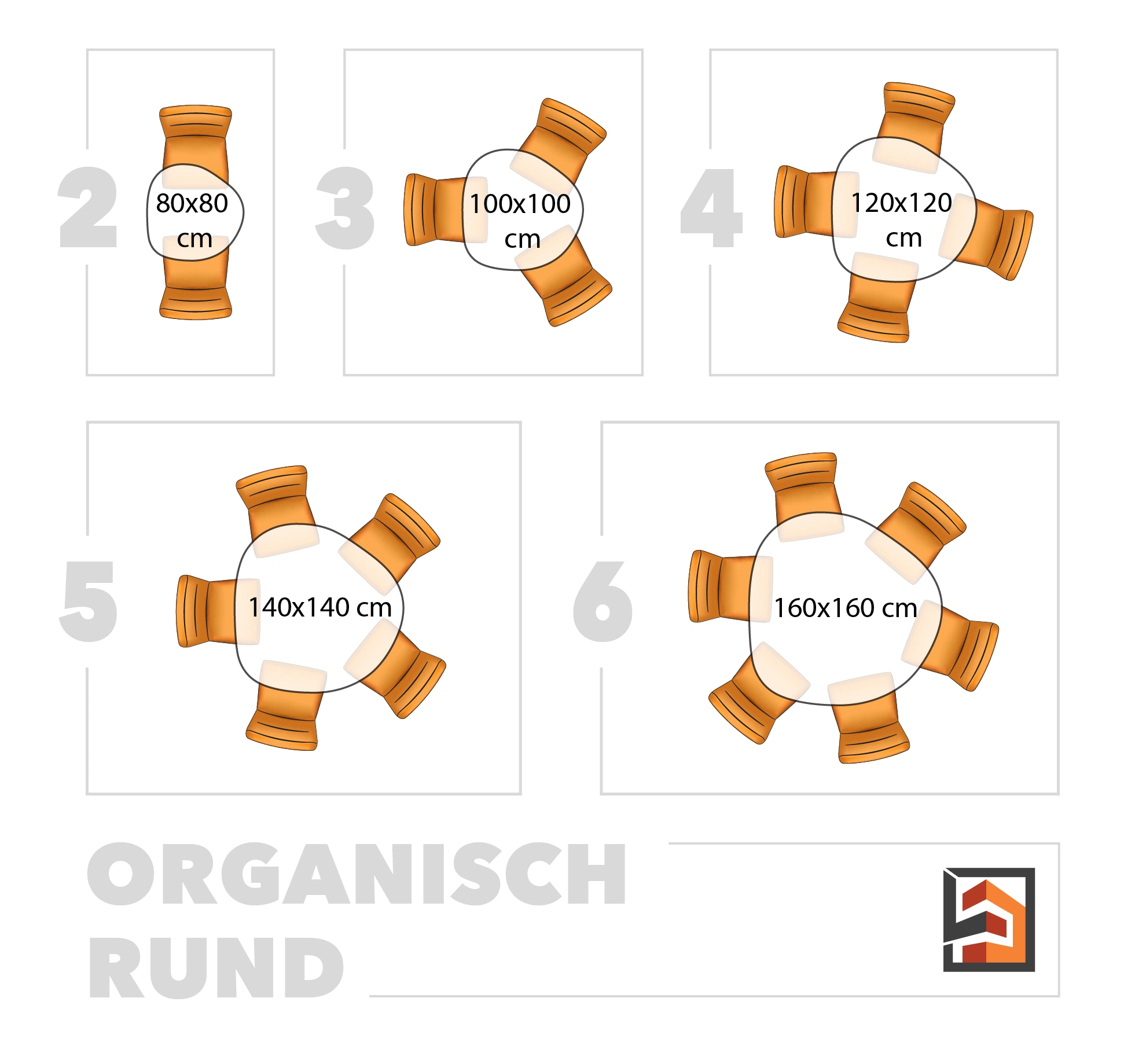 Der organische Tisch ist eine besondere Tischform mit natürlicher Ausstrahlung, die in Bezug auf Sitzplätze mit einem runden Tisch vergleichbar ist. Sie können die Stühle flexibel platzieren und es entsteht eine angenehme Kommunikation am Tisch. Auch hier haben die Breite der Stühle und der Abstand zwischen den Stühlen großen Einfluss auf die Anzahl der Sitzplätze.