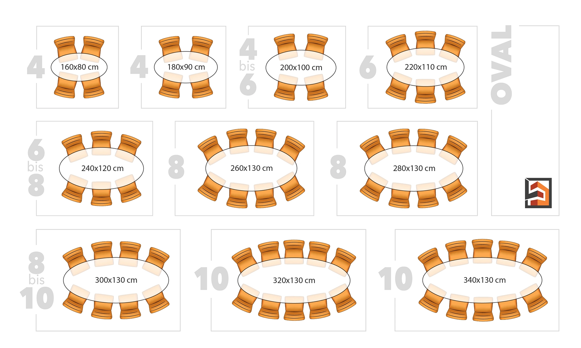 Der ovale Tisch ist eine elegante Tischform - zwischen oval und elliptisch - die Ihrem Interieur eine moderne und luxuriöse Ausstrahlung verleiht. Bitte beachten Sie, dass in der Regel weniger Platz für Stühle vorhanden ist als beispielsweise bei einem rechteckigen oder bootsförmigen Tisch. Dies liegt daran, dass die Stirnseiten nicht für Stühle geeignet sind und die Rundung an den Längsseiten Einfluss auf den verfügbaren Sitzplatz hat.