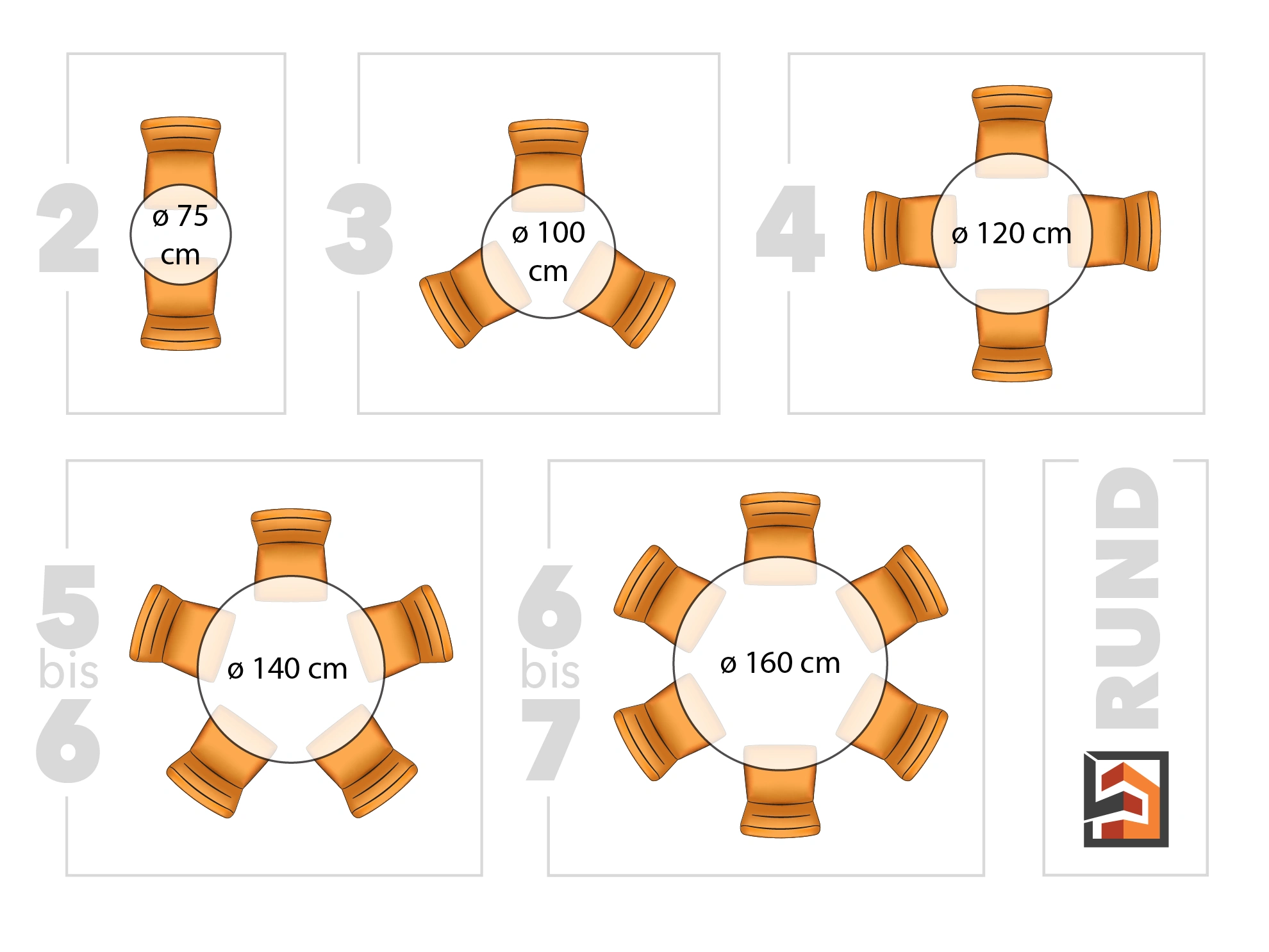 Der runde Tisch ist gemütlich, stilvoll, platzsparend und sehr praktisch. Da es keine Ecken gibt, entsteht eine angenehme Kommunikation am Tisch. Bei runden Tischen haben die Breite der Stühle und der Abstand zwischen den Stühlen großen Einfluss auf die Anzahl der Sitzplätze. Entscheiden Sie sich für schmale Stühle (40-45 cm) und einen minimalen Abstand (ca. 5 cm), können mehr Sitzplätze geschaffen werden.