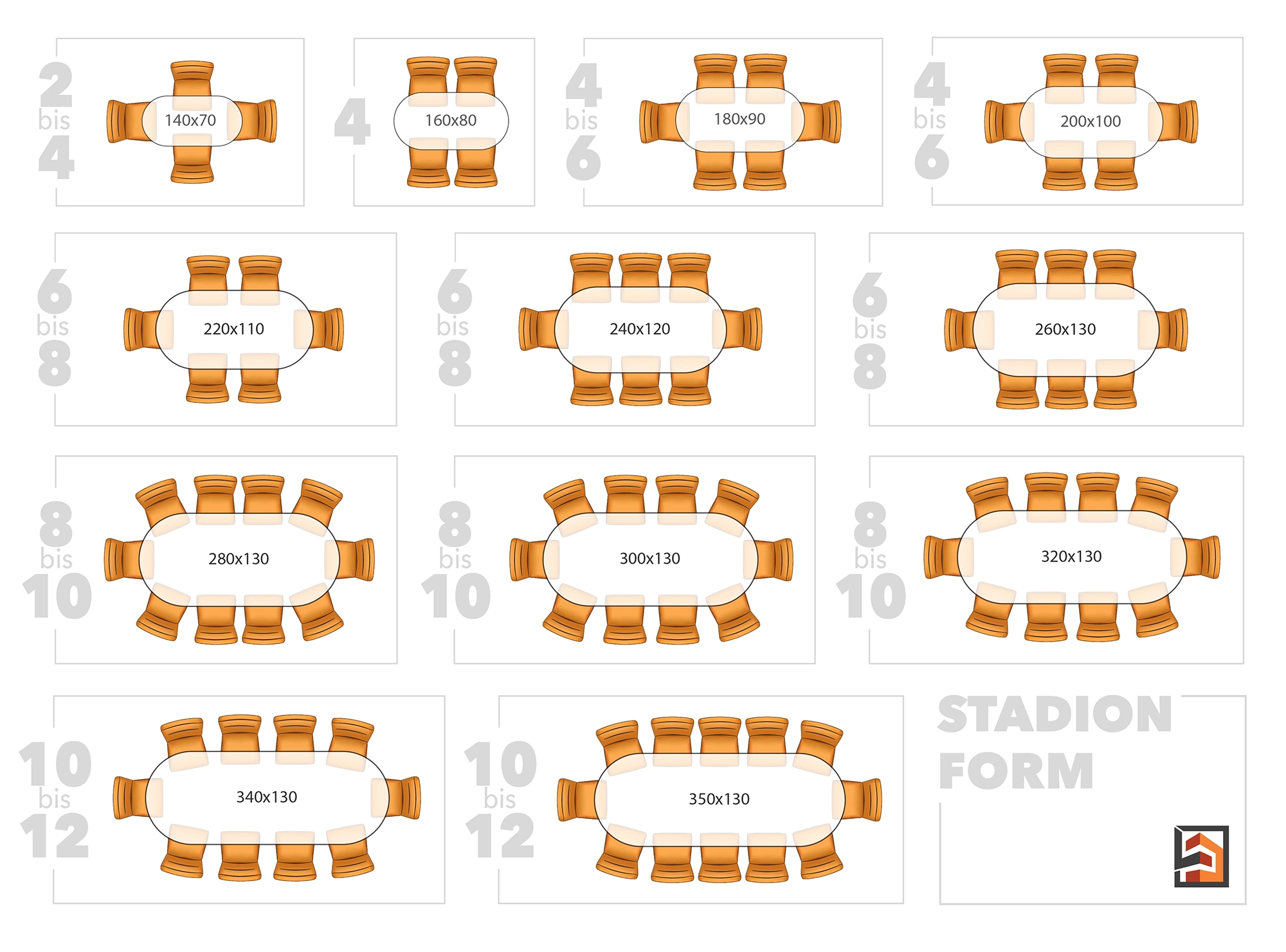Ein Tisch in Stadionform ist eine stilvolle Tischform mit klassischer Ausstrahlung. Bei diesem Tischtyp ist es möglich, einen Stuhl an der Stirnseite zu platzieren. Bitte beachten Sie jedoch, dass an den äußeren Seiten etwas weniger Platz vorhanden ist als bei einem geraden Tisch. Durch die Rundung haben diese Sitzplätze weniger Tischfläche und Beinfreiheit. Wir empfehlen daher, etwas mehr Spielraum einzuplanen und von etwas mehr Platz pro Stuhl sowie zwischen den Stühlen auszugehen, um optimalen Sitzkomfort zu gewährleisten.