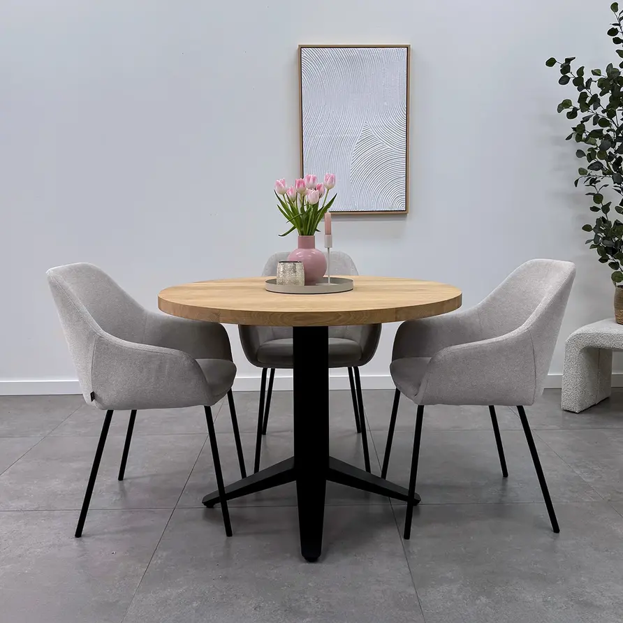 Ein schwarz beschichtetes Metall-Tischgestell, ideal für einen besonderen runden (Eichen)-Esstisch. Ein zentrales Tischuntergestell wird oft auch als Tischfuß oder Mittelfuß bezeichnet. Dieses "4-Fuß" Esstischgestell wird von erfahrenen Metallarbeitern von Hand geschweißt und mit einer hochwertigen schwarzen Pulverbeschichtung veredelt. Das schwarze Tischgestell hat eine stilvolle 4-Fuß-Form, wobei das Metallprofil von 12x12 cm besonders robust wirkt.