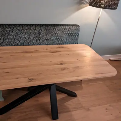 Tischplatte Eiche mit runden Ecken - nach Maß - 4 cm stark (40 mm, 1-lagig, massiv) - Eichenholz rustikal (B/C) - Hochwertiges Eichen-Massivholz verleimt - künstlich getrocknet (HF 8-12%). Eine schöne eichen Tischplatte mit runden Ecken, 40 mm stark, die von unseren Holzarbeitern mit viel Sorgfalt und Liebe maßgefertigt wird. Die abgerundeten Ecken verleihen der Tischplatte einen modernen Akzent – perfekt für einen stilvollen Look – und machen sie gleichzeitig kinderfreundlicher. Rustikales Eichenholz - mit einer B-Qualität Sichtseite - enthält Äste und Risse. Dies sorgt für ein natürliches und lebendiges Aussehen.