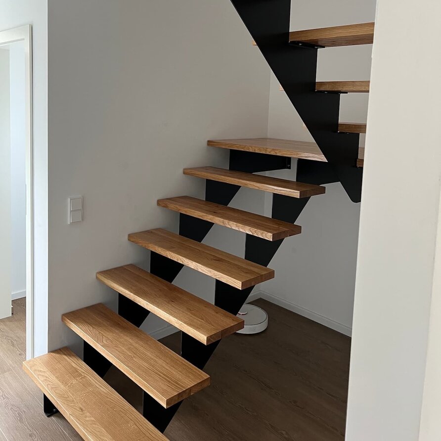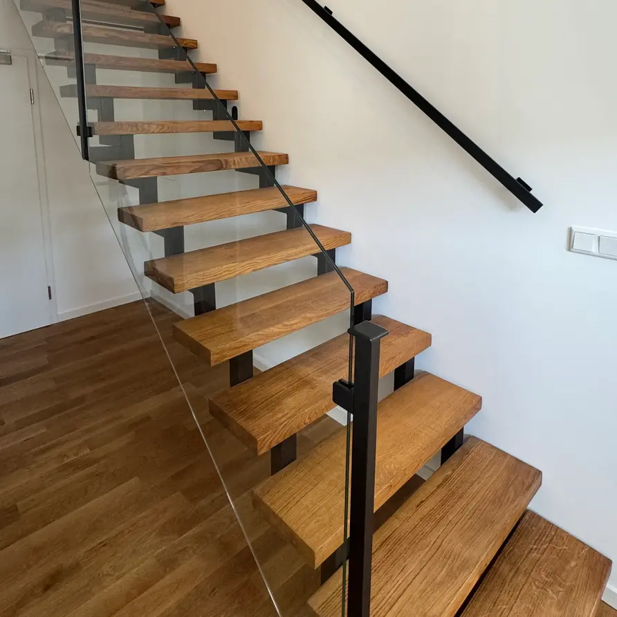 Treppenstufe Eiche massiv - nach Maß - 4 cm stark (4 mm, 1-lagig) - rustikalem Eichenholz (B/C) - breite Lamellen (9-12 cm) - Hochwertiges Eichen-Massivholz verleimt - künstlich getrocknet (HF 8-12%). Eine wunderschöne Eichen-Treppenstufe, 40 mm stark, die von unseren Holzarbeitern mit viel Sorgfalt und Liebe maßgefertigt wird. Maßgefertigte Treppenstufen aus Eiche eignen sich ideal für unterschiedliche Treppenarten und sind besonders beliebt bei offenen, schwebenden Treppen. Rustikales Eichenholz - mit einer B-Qualität Sichtseite - enthält Äste und Risse. Dies sorgt für ein natürliches und lebendiges Aussehen.