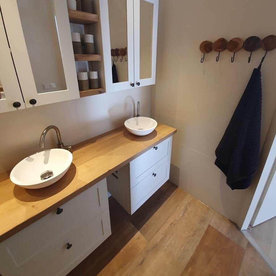 Waschtischplatte Eiche massiv - nach Maß - 3 cm stark (30 mm, 1-lagig) - Eichenholz rustikal (B/C) - Waschtisch- / Waschbeckenunterschrank inklusive 1–4 Bohrungen (Löcher) nach Wunsch - Hochwertiges Eichen-Massivholz verleimt - künstlich getrocknet (HF 8-12%). Eine schöne Waschtischplatte Eiche, 30 mm stark, die von unseren Holzarbeitern mit viel Sorgfalt und Liebe maßgefertigt wird. Der Eichen-Waschtischunterschrank ist speziell geeignet für ein oder zwei Aufsatzwaschbecken. Rustikales Eichenholz - mit einer B-Qualität Sichtseite - enthält Äste und Risse. Dies sorgt für ein natürliches und lebendiges Aussehen.