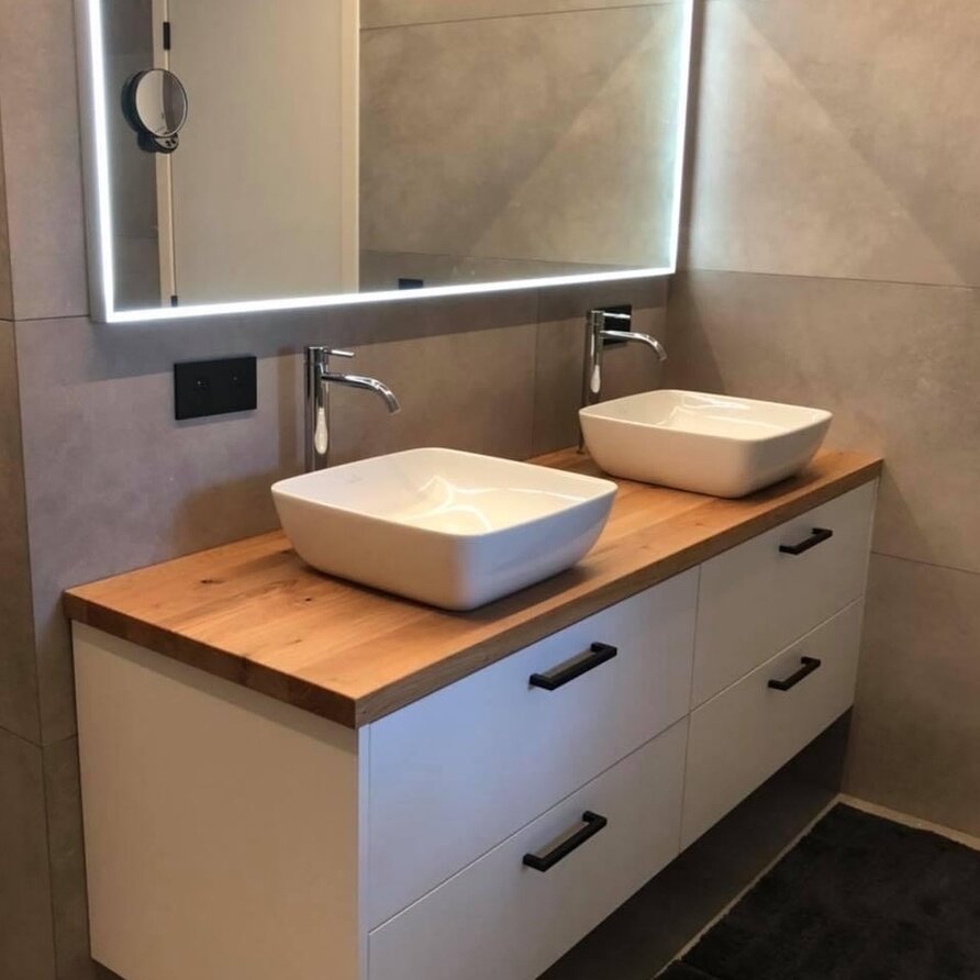 Waschtischplatte Eiche - 3 cm stark (massiv), gefertigt aus stimmungsvollem, rustikalem Eichenholz (B/C), individuell nach Maß. Ein hochwertiger Unterschrank für Aufsatzwaschbecken, inklusive präziser Bohrungen (Löcher) und nach Wunsch konfigurierbar! Lesen Sie mehr