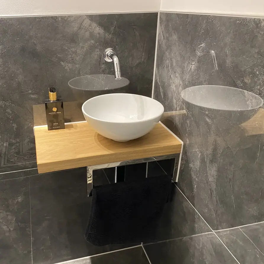 A-Qualität (A/B) Eichenholz ist bekannt für seine stimmungsvolle und luxuriöse Ausstrahlung. Diese Waschtischplatte wird mit durchgehenden Lamellen - mit einer Breite von 9-12 cm, extra breit für einen luxuriösen Akzent - in der Länge geliefert. Eine Eichen-Waschtischplatte wird standardmäßig unbehandelt, geschliffen und mit gefasten Kanten (einer 2 mm Radiusfase) ausgeliefert. Darüber hinaus bieten wir in unserem Online-Konfigurator verschiedene Zusatzoptionen an, um Ihre Waschtischplatte ganz nach Ihren Wünschen zu bearbeiten und zu behandeln.