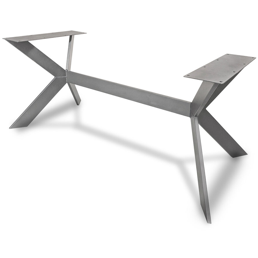 Ein X-Bein-Tischgestell aus Edelstahl, ideal für einen besonderen (Eichen)-Esstisch. Dieses Edelstahl-Tischgestell wird von erfahrenen Metallarbeitern handgeschweißt, und die Oberfläche wird leicht gebürstet, für einen edlen (etwas matteren) Farbton. Das Tischgestell hat eine trendige X-Form, wobei das Metallprofil von 2x10 cm besonders schlank wirkt. Die Tischbeine sind mit einem "Knick" versehen, der zusätzliche Tiefe verleiht und für eine luxuriöse Ausstrahlung sorgt.